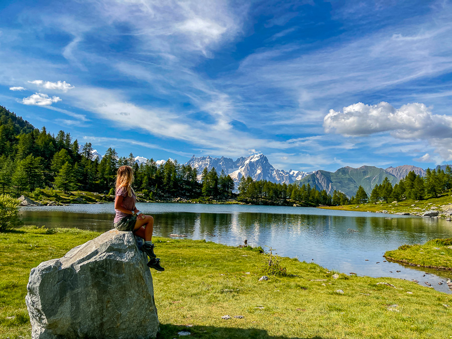 Ma dicevamo del massiccio: le imperiose montagne Grandes Jorasses raddoppiano gettandosi nelle azzurre acque del lago, uno spettacolo davvero pazzesco. Noi ci siamo stati in luglio e secondo me è un ottimo periodo perché ci sono tantissime fioriture, dunque tanto verde e colori. Ma ci è rimasto un pallino. Infatti un lato del lago è circordato da un bosco di larici: quanto deve essere affascinante in autunno, con i caldi colori del foliage? Sarebbe da scoprire…