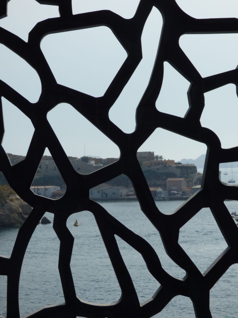 Lasciato l’Ombrière, noi – a pedagna – abbiamo raggiunto per primo il Fort Saint Jean perché miravamo al Mucem, il Museo delle Civiltà dell’Europa e del Mediterraneo, al top tra le cose che volevamo vedere a Marsiglia. Inaugurato nel 2013, anno in cui Marsiglia è stata capitale europea della cultura, per entrarvi si passa proprio dal Forte. Da una bella terrazza si accede ad una passerella sul mare e si giunge alla terrazza del Museo, dove si ha subito un assaggio dell’architettura bucherellata per cui è famoso.